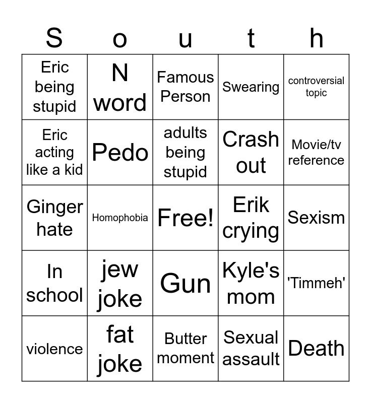This bingo card has a free space and 24 words: jew joke, fat joke, adults being stupid, violence, controversial topic, Eric being stupid, Eric acting like a kid, N word, Erik crying, Gun, Crash out, Ginger hate, Kyle's mom, 'Timmeh', Pedo, Sexual assault, Sexism, Famous Person, Movie/tv reference, Homophobia, Death, In school, Swearing and Butter moment.