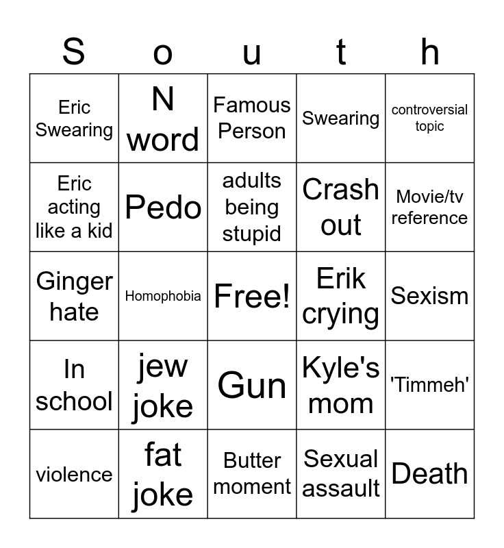 This bingo card has a free space and 24 words: jew joke, fat joke, adults being stupid, violence, controversial topic, Eric Swearing, Eric acting like a kid, N word, Erik crying, Gun, Crash out, Ginger hate, Kyle's mom, 'Timmeh', Pedo, Sexual assault, Sexism, Famous Person, Movie/tv reference, Homophobia, Death, In school, Swearing and Butter moment.