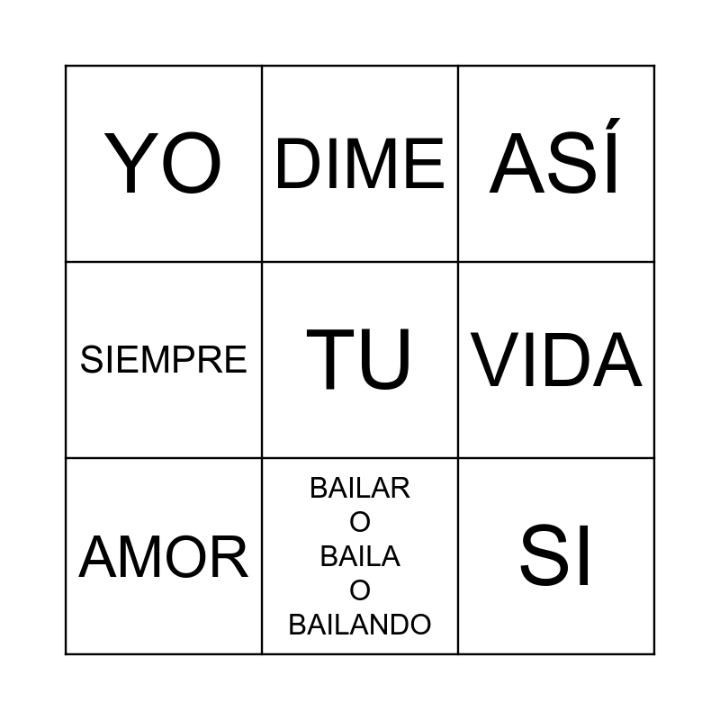 This bingo card has 9 words: AMOR, ASÍ, DIME, SIEMPRE, YO, VIDA, TU, SI and BAILAR O BAILA O BAILANDO.