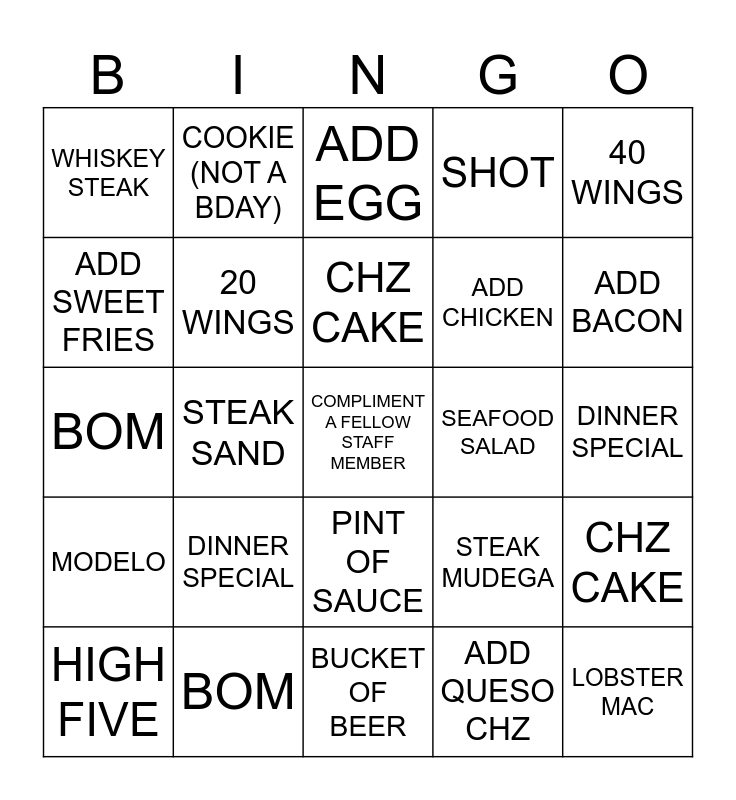 This bingo card has a free space and 24 words: DINNER SPECIAL, BOM, CHZ CAKE, HIGH FIVE, 40 WINGS, WHISKEY STEAK, ADD SWEET FRIES, COOKIE (NOT A BDAY), SEAFOOD SALAD, PINT OF SAUCE, ADD CHICKEN, BOM, STEAK MUDEGA, CHZ CAKE, 20 WINGS, ADD QUESO CHZ, DINNER SPECIAL, ADD EGG, ADD BACON, STEAK SAND, LOBSTER MAC, MODELO, SHOT and BUCKET OF BEER.