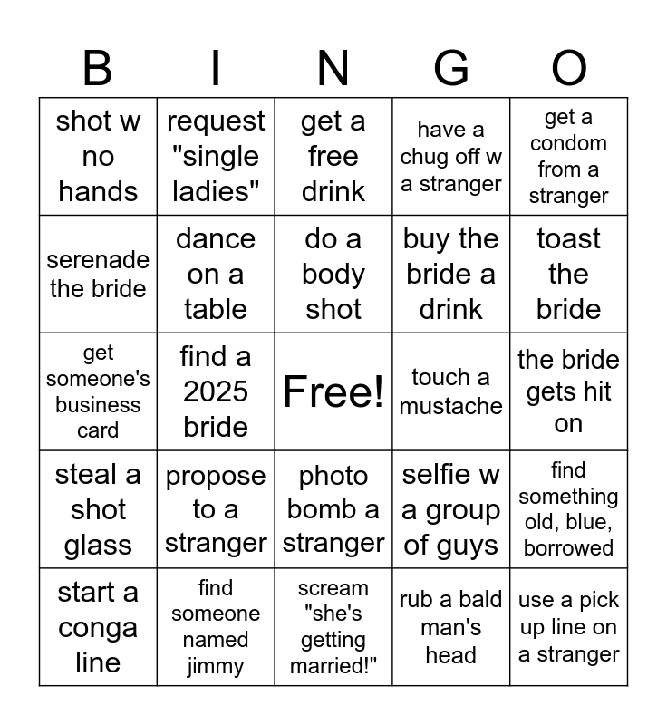 This bingo card has a free space and 24 words: propose to a stranger, find someone named jimmy, do a body shot, start a conga line, get a condom from a stranger, shot w no hands, serenade the bride, request "single ladies", touch a mustache, photo bomb a stranger, buy the bride a drink, get someone's business card, selfie w a group of guys, find something old, blue, borrowed, dance on a table, rub a bald man's head, the bride gets hit on, get a free drink, toast the bride, find a 2025 bride, use a pick up line on a stranger, steal a shot glass, have a chug off w a stranger and scream "she's getting married!".