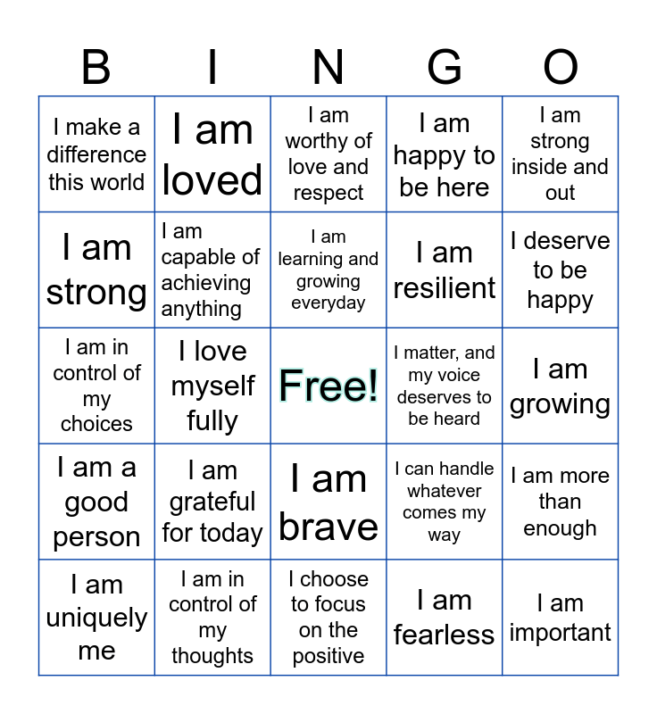 This bingo card has a free space and 29 words: I can achieve anything, I am in control of my thoughts, I am worthy of love and respect, I am proud of myself and my progress, I am strong inside and out, I make a difference this world, I am capable of achieving anything, I am learning and growing everyday, I matter, and my voice deserves to be heard, I am more than enough, I am uniquely me, I love myself fully, I am fearless, I am important, I am in control of my choices, I am valuable, I choose to focus on the positive, I can handle whatever comes my way, I deserve to be happy, I am a good person, I am grateful for today, I am allowed to express my feelings, I am resilient, I am growing, I am strong, I am loved, I am brave, I am happy to be here and I am proud of who I am.