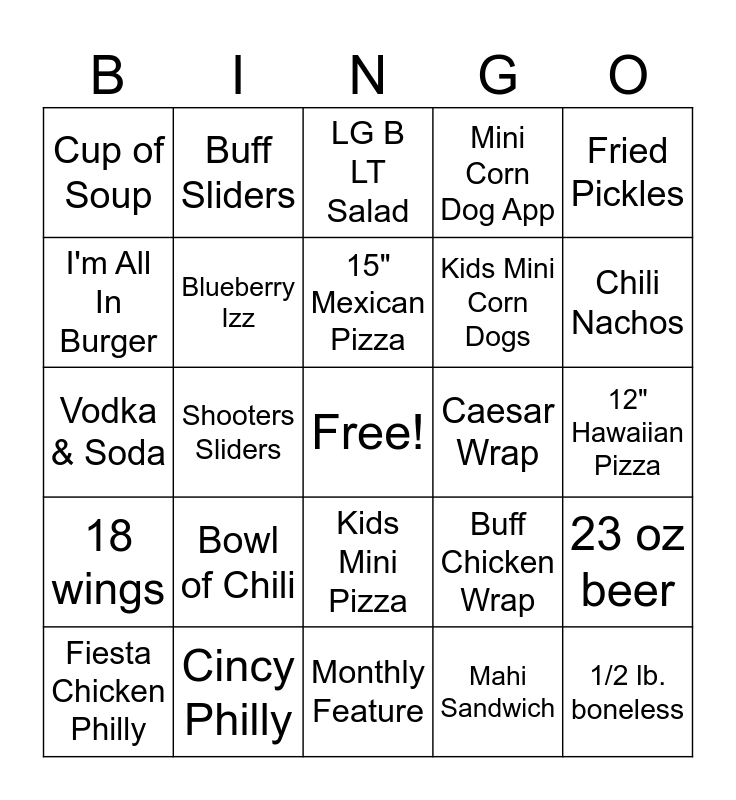 This bingo card has a free space and 24 words: Bowl of Chili, Cincy Philly, 15" Mexican Pizza, Fiesta Chicken Philly, Fried Pickles, Cup of Soup, I'm All In Burger, Buff Sliders, Caesar Wrap, Kids Mini Pizza, Kids Mini Corn Dogs, Vodka & Soda, Buff Chicken Wrap, 23 oz beer, Blueberry Izz, Mahi Sandwich, 12" Hawaiian Pizza, LG BLT Salad, Chili Nachos, Shooters Sliders, 1/2 lb. boneless, 18 wings, Mini Corn Dog App and Monthly Feature.