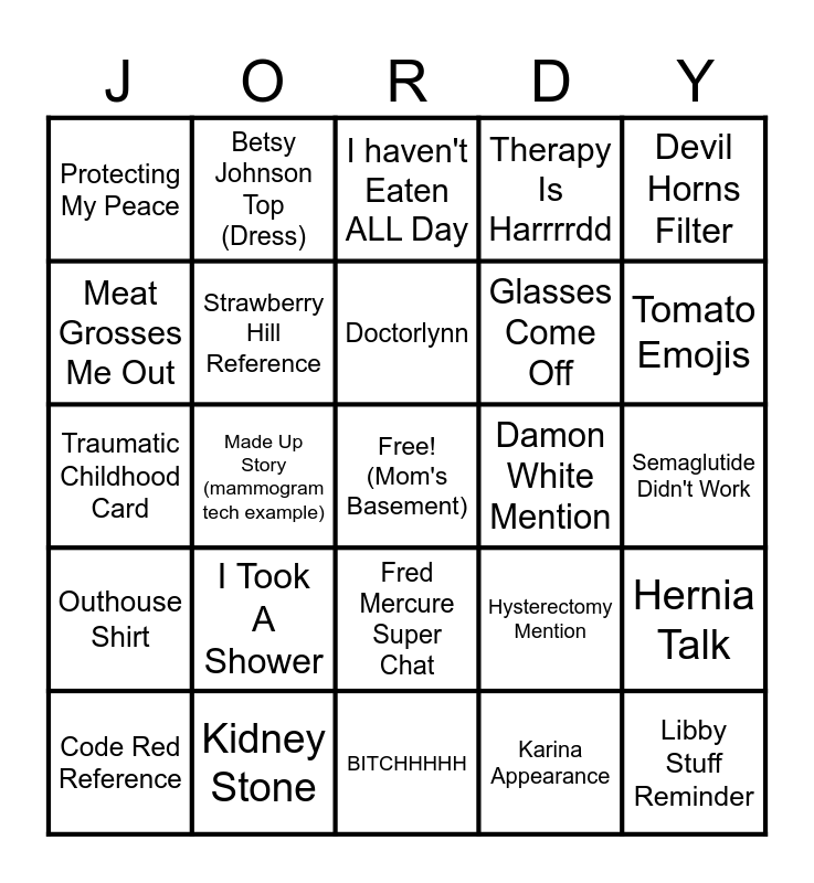 This bingo card has a free space and 88 words: BPD, BOOL!, Fred Mercure Super Chat, Choosey, LEZEAT, Barbie Tank Top, Kaitbird Gifted Subs, Mr.Snowflake Appearance, Lymphedema/Lipidaemia, Bingo Night, The Big One, Catsdamnmeow Gifted Subs, Hernia Talk, Semaglutide Didn't Work, Non-Apology, Doctorlynn, Diddylynn, Low Hanging Fruit, Glasses Jordy, Contacts Jordy, VickyG Gifted Subs, Cancer Sympathy Card, Traumatic Childhood Card, BIG?!?!, Karina Appearance, Destiny Mention, Krystal Mention, Casey Mention, Jade Mention, Emily Mention, I haven't Eaten ALL Day, Therapy Is Harrrrdd, LEGOs, Hecticana, I Took A Shower, Meat Grosses Me Out, Protecting My Peace, Wateroflife Gifted Subs, Crocodile Tears, Tomato Emojis, Made Up Story (mammogram tech example), I'm A Great Pet Parent, PeePad City, Hysterectomy Mention, Damon White Mention, Masking, Foster Care Card, Rain and Petals Eavesdrop Reminder, I Have Grown, Glasses Come Off, Camera Issues, Calorie Counting, Twinkie Proof Of Life, WoW Mentioned, Camera Malfunction, Stream Crash, Outhouse Shirt, Betsy Johnson Top (Dress), Casting Call (Tik Tok Thirst Traps), New GF, MEAN!, Random Dot From Green Screen, Weight above 500lbez, Weight above 470lbez, Barely 12 min Vlog, Kidney Stone, Eating On Camera, Strawberry Hill Reference, Code Red Reference, Libby Stuff Reminder, Video Over 20 mins, Cheflynn, Manipulation Of Language, Devil Horns Filter, Hypochondriaclynn, Therapy Appointment, Amber Sock Account In Chat, FBI Frank, BITCHHHHH, BAD!, Word Pronounced VERY Wrong, Food Aggression, Cycle Reset, Dancing After Eating, Double Carb, Fat Hall Of Fame Addition, Talks About When She Went Viral and Obscure Look Alike Reference.