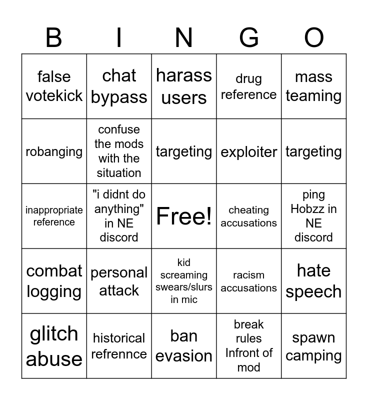 This bingo card has a free space and 24 words: personal attack, historical refrennce, targeting, glitch abuse, mass teaming, false votekick, robanging, chat bypass, cheating accusations, kid screaming swears/slurs in mic, exploiter, inappropriate reference, racism accusations, hate speech, confuse the mods with the situation, break rules Infront of mod, ping Hobzz in NE discord, harass users, targeting, "i didnt do anything" in NE discord, spawn camping, combat logging, drug reference and ban evasion.