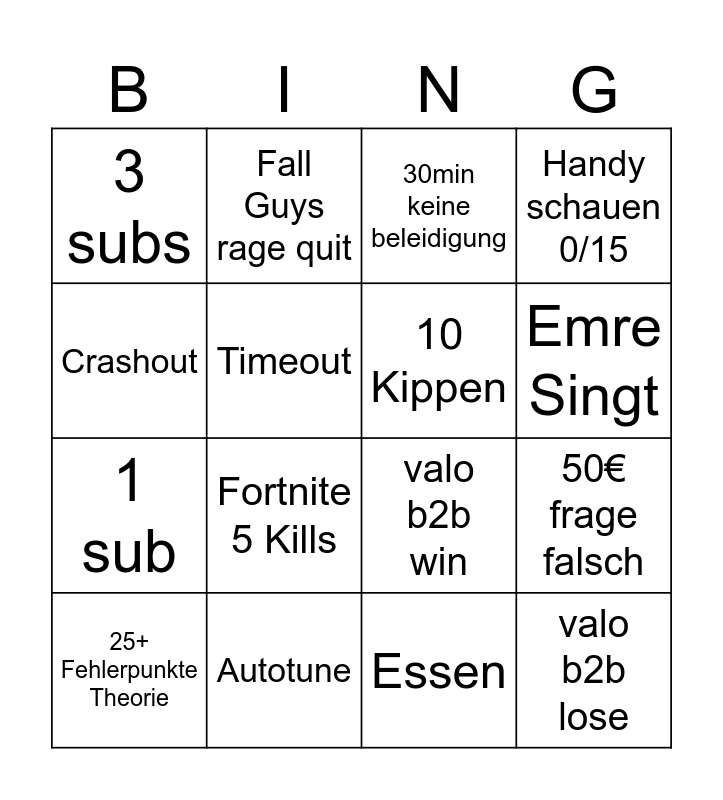 This bingo card has 16 words: Autotune, 50€ frage falsch, 30min keine beleidigung, 3 subs, 1 sub, Fall Guys rage quit, valo b2b win, Essen, Crashout, Timeout, 25+ Fehlerpunkte Theorie, Handy schauen 0/15, Fortnite 5 Kills, Emre Singt, 10 Kippen and valo b2b lose.