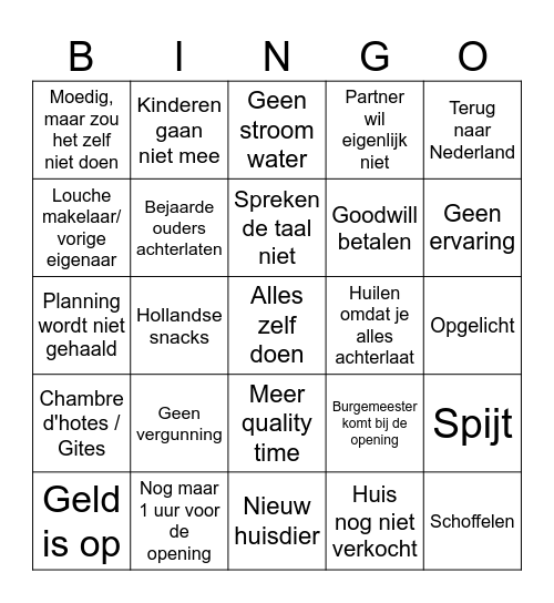 This bingo card has 25 words: Geen vergunning, Nieuw huisdier, Spreken de taal niet, Geld is op, Terug naar Nederland, Moedig, maar zou het zelf niet doen, Louche makelaar/ vorige eigenaar, Kinderen gaan niet mee, Huilen omdat je alles achterlaat, Meer quality time, Goodwill betalen, Planning wordt niet gehaald, Burgemeester komt bij de opening, Spijt, Bejaarde ouders achterlaten, Schoffelen, Opgelicht, Geen stroom water, Geen ervaring, Hollandse snacks, Alles zelf doen, Nog maar 1 uur voor de opening, Chambre d'hotes / Gites, Partner wil eigenlijk niet and Huis nog niet verkocht.