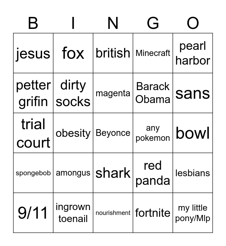 This bingo card has a free space and 24 words: amongus, ingrown toenail, magenta, 9/11, pearl harbor, jesus, petter grifin, fox, any pokemon, shark, Barack Obama, trial court, red panda, lesbians, dirty socks, fortnite, bowl, british, sans, obesity, my little pony/Mlp, spongebob, Minecraft and nourishment.