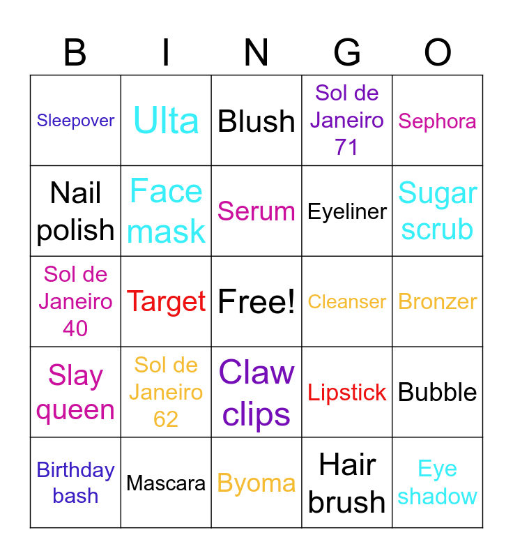 This bingo card has a free space and 24 words: Sol de Janeiro 62, Mascara, Serum, Birthday bash, Sephora, Sleepover, Nail polish, Ulta, Cleanser, Claw clips, Eyeliner, Sol de Janeiro 40, Lipstick, Bubble, Face mask, Hair brush, Bronzer, Blush, Sugar scrub, Target, Eye shadow, Slay queen, Sol de Janeiro 71 and Byoma.