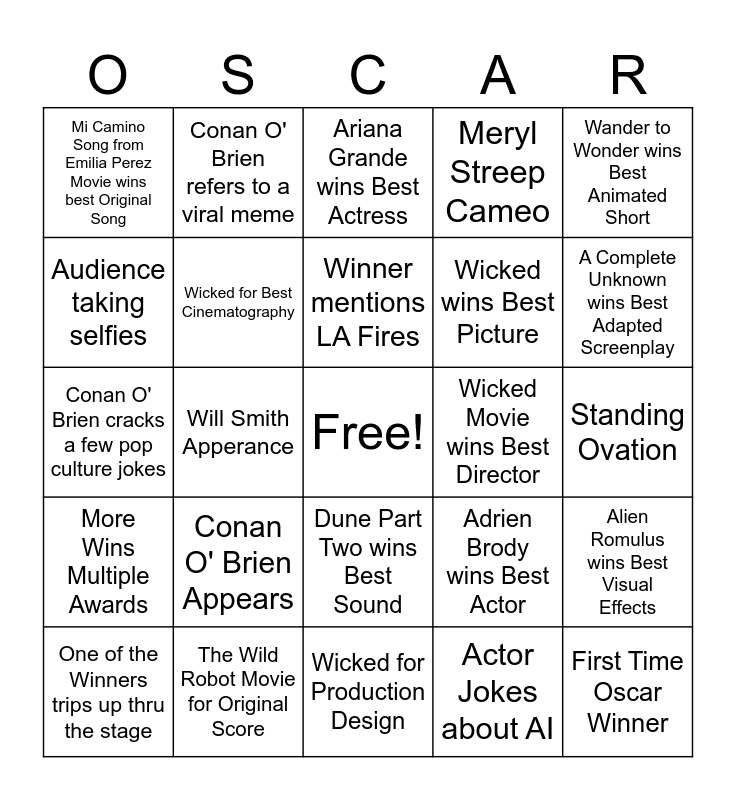 This bingo card has a free space and 24 words: Conan O' Brien Appears, The Wild Robot Movie for Original Score, Winner mentions LA Fires, One of the Winners trips up thru the stage, Wander to Wonder wins Best Animated Short, Mi Camino Song from Emilia Perez Movie wins best Original Song, Audience taking selfies, Conan O' Brien refers to a viral meme, Wicked Movie wins Best Director, Dune Part Two wins Best Sound, Wicked wins Best Picture, Conan O' Brien cracks a few pop culture jokes, Adrien Brody wins Best Actor, Alien Romulus wins Best Visual Effects, Wicked for Best Cinematography, Actor Jokes about AI, Standing Ovation, Ariana Grande wins Best Actress, A Complete Unknown wins Best Adapted Screenplay, Will Smith Apperance, First Time Oscar Winner, More Wins Multiple Awards, Meryl Streep Cameo and Wicked for Production Design.