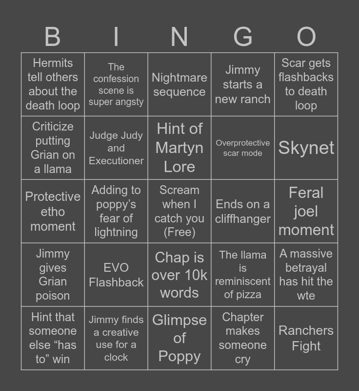 This bingo card has a free space and 25 words: EVO Flashback, Glimpse of Poppy, Hint of Martyn Lore, Hint that someone else “has to” win, Scar gets flashbacks to death loop, Hermits tell others about the death loop, Criticize putting Grian on a llama, The confession scene is super angsty, Ends on a cliffhanger, Chap is over 10k words, Overprotective scar mode, Protective etho moment, The llama is reminiscent of pizza, A massive betrayal has hit the wte, Judge Judy and Executioner, Jimmy nesting moment, Feral joel moment, Nightmare sequence, Skynet, Adding to poppy’s fear of lightning, Ranchers Fight, Jimmy finds a creative use for a clock, Jimmy gives Grian poison, Jimmy starts a new ranch and Chapter makes someone cry.