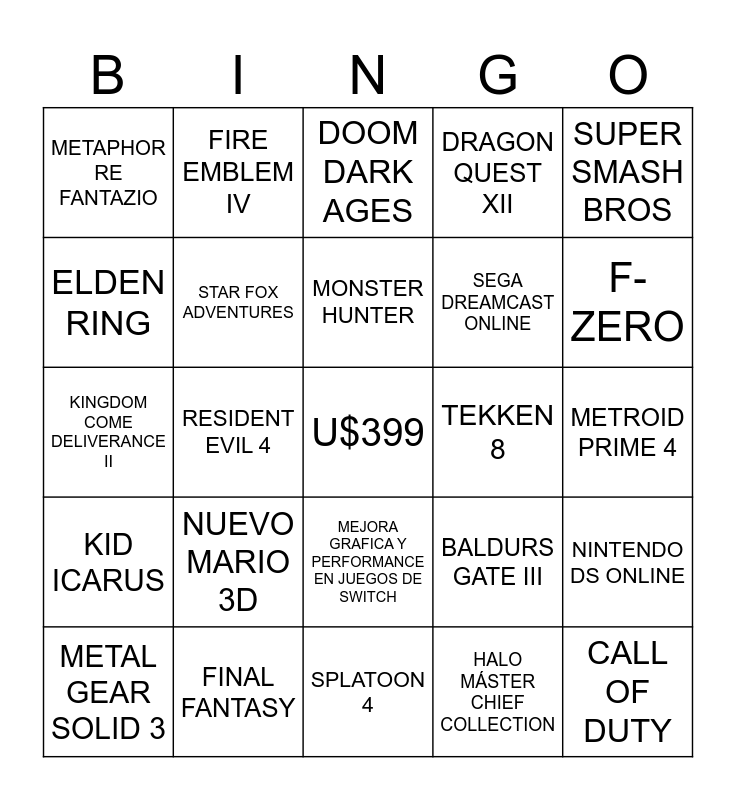 This bingo card has a free space and 24 words: NUEVO MARIO 3D, FINAL FANTASY, MONSTER HUNTER, METAL GEAR SOLID 3, SUPER SMASH BROS, METAPHOR RE FANTAZIO, ELDEN RING, FIRE EMBLEM IV, TEKKEN 8, MEJORA GRAFICA Y PERFORMANCE EN JUEGOS DE SWITCH, SEGA DREAMCAST ONLINE, KINGDOM COME DELIVERANCE II, BALDURS GATE III, NINTENDO DS ONLINE, STAR FOX ADVENTURES, HALO MÁSTER CHIEF COLLECTION, METROID PRIME 4, DOOM DARK AGES, F-ZERO, RESIDENT EVIL 4, CALL OF DUTY, KID ICARUS, DRAGON QUEST XII and SPLATOON 4.