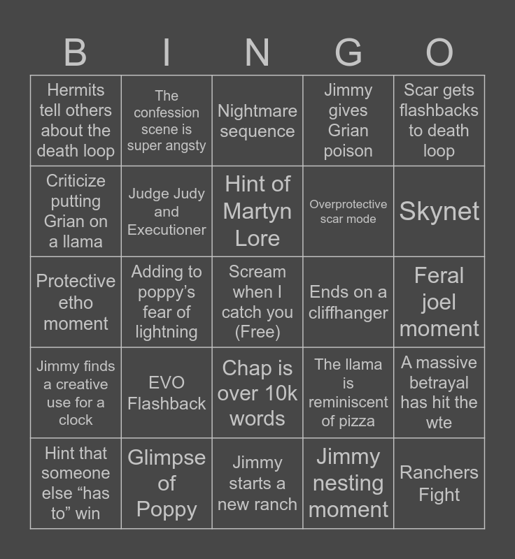 This bingo card has a free space and 24 words: EVO Flashback, Glimpse of Poppy, Hint of Martyn Lore, Hint that someone else “has to” win, Scar gets flashbacks to death loop, Hermits tell others about the death loop, Criticize putting Grian on a llama, The confession scene is super angsty, Ends on a cliffhanger, Chap is over 10k words, Overprotective scar mode, Protective etho moment, The llama is reminiscent of pizza, A massive betrayal has hit the wte, Judge Judy and Executioner, Jimmy nesting moment, Feral joel moment, Nightmare sequence, Skynet, Adding to poppy’s fear of lightning, Ranchers Fight, Jimmy finds a creative use for a clock, Jimmy gives Grian poison and Jimmy starts a new ranch.