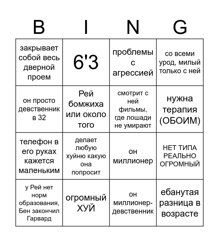 This bingo card has 16 words: огромный ХУЙ, НЕТ ТИПА РЕАЛЬНО ОГРОМНЫЙ, проблемы с агрессией, закрывает собой весь дверной проем, телефон в его руках кажется маленьким, 6'3, он миллионер, он миллионер-девственник, он просто девственник в 32, Рей бомжиха или около того, у Рей нет норм образования, Бен закончил Гарвард, со всеми урод, милый только с ней, делает любую хуйню какую она попросит, нужна терапия (ОБОИМ), смотрит с ней фильмы, где лошади не умирают and ебанутая разница в возрасте.