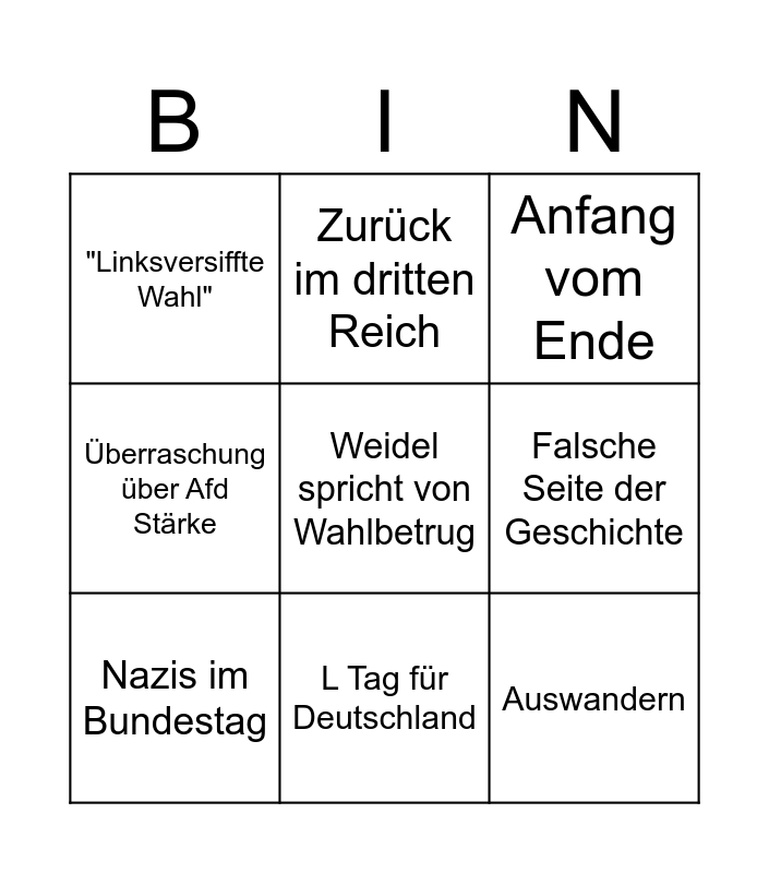 This bingo card has a free space and 8 words: Falsche Seite der Geschichte, Anfang vom Ende, Zurück im dritten Reich, Nazis im Bundestag, "Linksversiffte Wahl", Auswandern, Überraschung über Afd Stärke and L Tag für Deutschland.