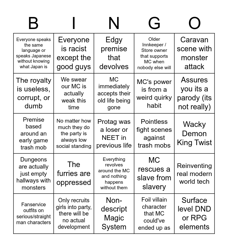 This bingo card has a free space and 24 words: The furries are oppressed, Only recruits girls into party, there will be no actual development, MC immediately accepts their old life being gone, Fanservice outfits on serious/straight man characters, Caravan scene with monster attack, Everyone speaks the same language or speaks Japanese without knowing what Japan is, The royalty is useless, corrupt, or dumb, Everyone is racist except the good guys, Pointless fight scenes against trash mobs, Everything revolves around the MC and nothing happens without them, MC's power is from a weird quirky habit, Premise based around an early game trash mob, MC rescues a slave from slavery, Reinventing real modern world tech, We swear our MC is actually weak this time, Foil villain character that MC could've ended up as, Wacky Demon King Twist, Edgy premise that devolves, Assures you its a parody (its not really), No matter how much they do the party is always low social standing, Surface level DND or RPG elements, Dungeons are actually just empty hallways with monsters, Older Innkeeper / Store owner that supports MC when nobody else will and Non-descript Magic System.