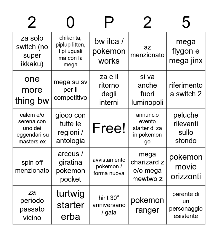 This bingo card has a free space and 24 words: arceus / giratina pokemon pocket, turtwig starter erba, za e il ritorno degli interni, za periodo passato vicino, mega flygon e mega jinx, za solo switch (no super ikkaku), one more thing bw, chikorita, piplup litten, tipi uguali ma con la mega, annuncio evento starter di za in pokemon go, avvistamento pokemon / forma nuova, si va anche fuori luminopoli, calem e/o serena con uno dei leggendari su masters ex, mega charizard z e/o mega mewtwo z, pokemon movie orizzonti, mega su sv per il competitivo, pokemon ranger, peluche rilevanti sullo sfondo, bw ilca / pokemon works, riferimento a switch 2, gioco con tutte le regioni / antologia, parente di un personaggio esistente, spin off menzionato, az menzionato and hint 30° anniversario / gaia.