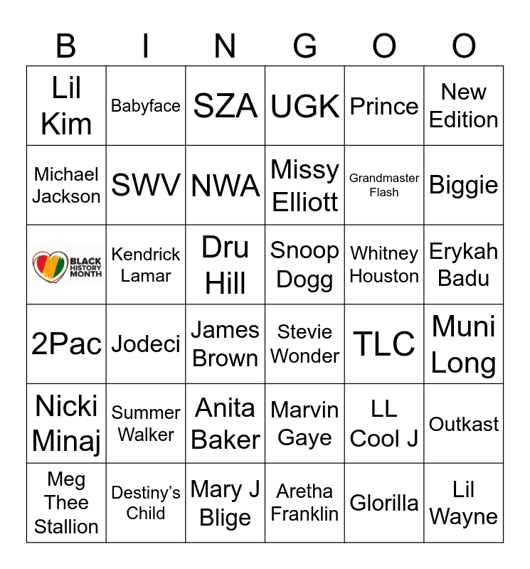 This bingo card has 1 images and 35 words: Marvin Gaye, Anita Baker, Aretha Franklin, Michael Jackson, 2Pac, Snoop Dogg, SWV, Mary J Blige, Prince, LL Cool J, Biggie, UGK, Outkast, Kendrick Lamar, Missy Elliott, Lil Kim, Nicki Minaj, Whitney Houston, SZA, Dru Hill, Jodeci, Stevie Wonder, James Brown, TLC, Babyface, Grandmaster Flash, Destiny’s Child, NWA, New Edition, Lil Wayne, Meg Thee Stallion, Muni Long, Erykah Badu, Summer Walker and Glorilla.