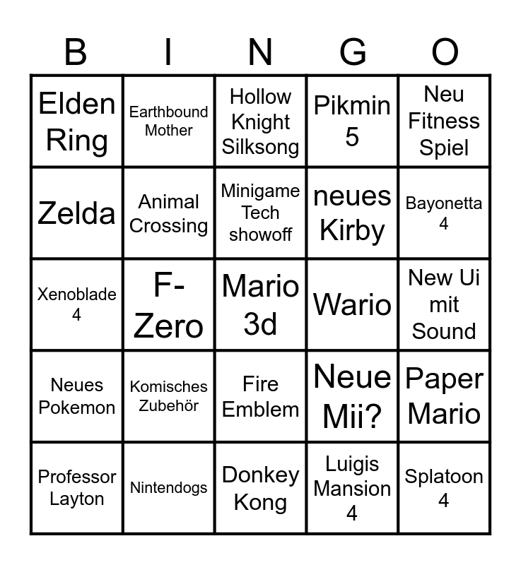 This bingo card has a free space and 24 words: Komisches Zubehör, Nintendogs, Minigame Tech showoff, Professor Layton, Neu Fitness Spiel, Elden Ring, Zelda, Earthbound Mother, Wario, Fire Emblem, neues Kirby, Xenoblade 4, Neue Mii?, Paper Mario, Animal Crossing, Luigis Mansion 4, New Ui mit Sound, Hollow Knight Silksong, Bayonetta 4, F-Zero, Splatoon 4, Neues Pokemon, Pikmin 5 and Donkey Kong.