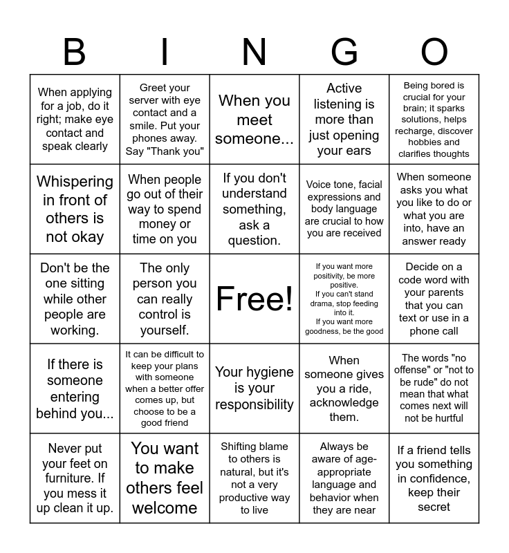 This bingo card has a free space and 38 words: Before posting a photo or experience about someone, If seating is scarce, offer up your seat to the elderly or those who look like they need a place to rest more than you do, When an adult texts you, When people go out of their way to spend money or time on you, The words "no offense" or "not to be rude" do not mean that what comes next will not be hurtful, It can be difficult to keep your plans with someone when a better offer comes up, but choose to be a good friend, If you don't understand something, ask a question., When you're with other people, your earbuds should not be in your ears., Being bored is crucial for your brain; it sparks solutions, helps recharge, discover hobbies and clarifies thoughts, Voice tone, facial expressions and body language are crucial to how you are received, The only person you can really control is yourself., Active listening is more than just opening your ears, If a friend tells you something in confidence, keep their secret, Decide on a code word with your parents that you can text or use in a phone call, Whispering in front of others is not okay, If there is someone entering behind you..., Vocalize your appreciation frequently, When you meet someone..., Greet the person standing there, invite them in if you know them well..., If you want more positivity, be more positive. If you can't stand drama, stop feeding into it. If you want more goodness, be the good, When applying for a job, do it right; make eye contact and speak clearly, You want to make others feel welcome, When someone asks you what you like to do or what you are into, have an answer ready, Never put your feet on furniture. If you mess it up clean it up., I am really sorry I did..., Shifting blame to others is natural, but it's not a very productive way to live, Always acknowledge the adults in the home, Mental health is serious and it is important to check in on your friends, Planning your life so you can be punctual is a critical skill, Don't ignore people. If you can't make it, just let them know, You can't always invite everyone to everything, but..., Your hygiene is your responsibility, Always be aware of age-appropriate language and behavior when they are near, Greet your server with eye contact and a smile. Put your phones away. Say "Thank you", If you are in a public place... Same rule goes for anything else the creates sound, When someone gives you a ride, acknowledge them., Don't be the one sitting while other people are working. and If you find yourself with people you know know....