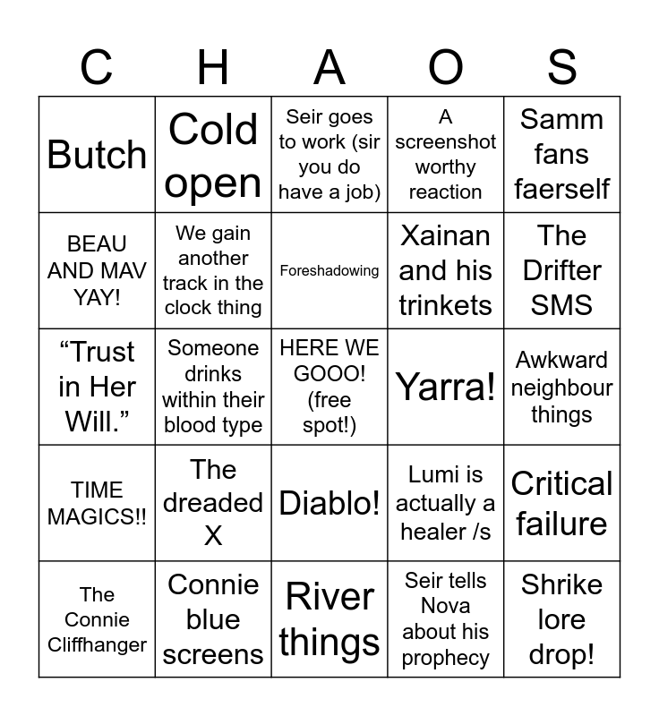 This bingo card has a free space and 44 words: Heartbreaking Romeo and Juliet things, Shrike lore drop!, Doom and Gloom, The Connie Cliffhanger, We find out who Mortal!Lumi was, Seir tells Nova about his prophecy, Seir goes to work (sir you do have a job), Sea screams/ barks in chat /lh, Samm fans faerself, Connie blue screens, A screenshot worthy reaction, Yarra!, Diablo!, The dreaded X, Chaos lore, River things, Moon things, “Trust in Her Will.”, Xainan being a tired father, The Drifter SMS, Cold open, Hot NPC spotted!, Cat spotted! (seen/heard), Butch, Awkward roommate things, Awkward neighbour things, Rho, my beloved!, TVASH RAHHH, Lumi is actually a healer /s, TIME MAGICS!!, Critical success!, Critical failure, Mixed success, Spider things, Someone drinks within their blood type, someone drinks outside of their blood type, Someone pulls an all-nighter (all dayer?), Someone puts up a sign, Foreshadowing, BEAU AND MAV YAY!, Xainan and his trinkets, Bookstore time!, We gain another track in the clock thing and Ying He is shadowy.
