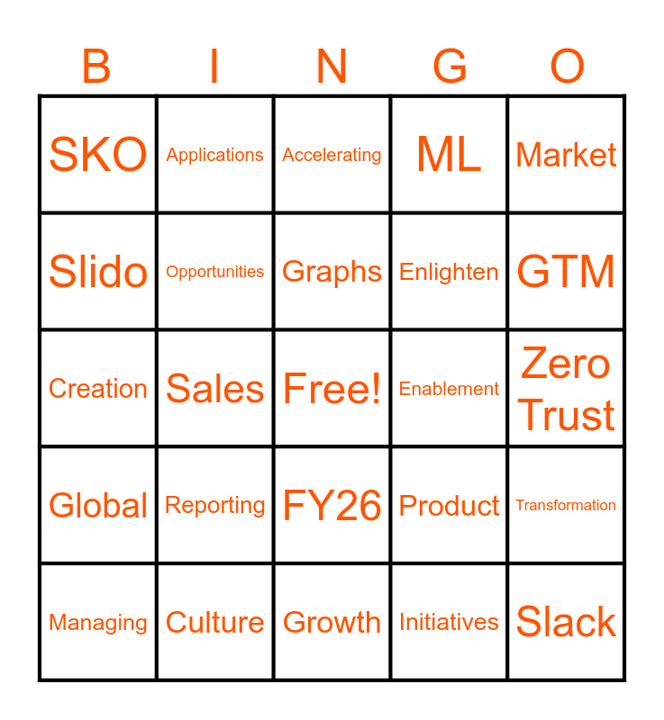 This bingo card has a free space and 58 words: Services, Culture, Tenants, Global, Initiatives, ERG, Opportunities, Customer, Enlighten, Breach, ML, VPCs, Agents, Velocity, Ecosystem, SKO, Slack, Market, Security, Graphs, Enablement, Accelerating, Managing, Transformation, AI, Zero Trust, Partner, Together, GTM, Creation, Voice, Illumineers, Challenges, Results, Amplification, Insights, Core Values, Sales, Creation, Communication, Reporting, Commercial, Product, Bold, Priorities, Onwards, Foundation, FY26, Growth, Federal, Campaigns, Orange, Success, HQ, Applications, Illumio, Slido and Modules.