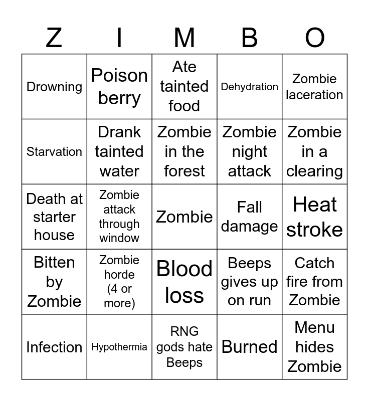 This bingo card has a free space and 24 words: Zombie horde (4 or more), Hypothermia, Zombie in the forest, Infection, Zombie laceration, Drowning, Starvation, Poison berry, Fall damage, Blood loss, Zombie night attack, Death at starter house, Beeps gives up on run, Catch fire from Zombie, Drank tainted water, Burned, Heat stroke, Ate tainted food, Zombie in a clearing, Zombie attack through window, Menu hides Zombie, Bitten by Zombie, Dehydration and RNG gods hate Beeps.