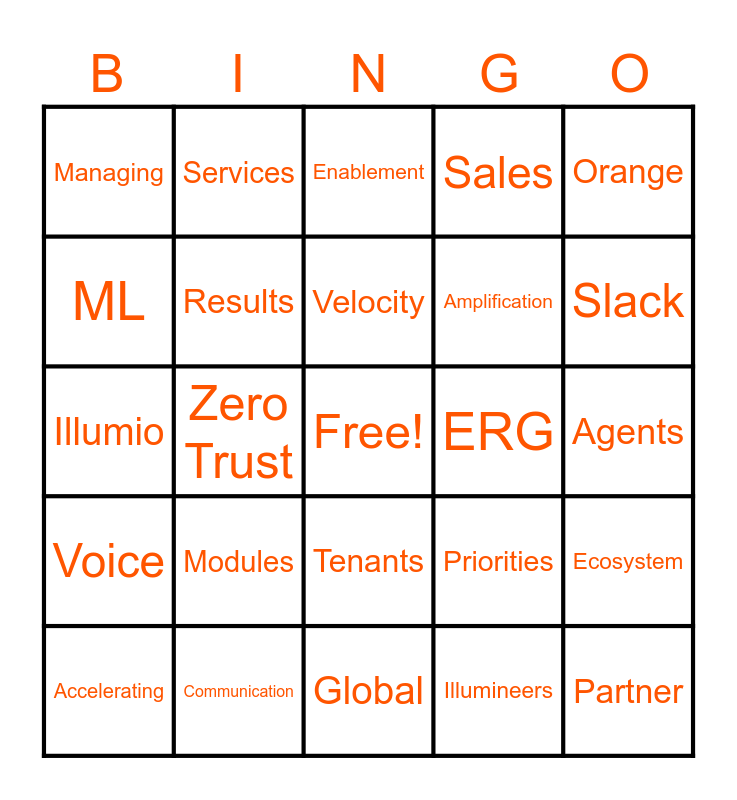 This bingo card has a free space and 58 words: Creation, Communication, Core Values, Voice, Illumineers, Challenges, Results, Creation, Amplification, Insights, Sales, Commercial, Breach, Onwards, Campaigns, Managing, Partner, Orange, Reporting, Velocity, ERG, Enablement, Accelerating, Ecosystem, VPCs, Agents, SKO, Graphs, Slack, Transformation, Together, GTM, Success, Applications, Market, Security, AI, Zero Trust, Illumio, Slido, Modules, Bold, Priorities, HQ, Foundation, Opportunities, Customer, Tenants, Global, FY26, Growth, Federal, Initiatives, Enlighten, Services, Culture, ML and Product.