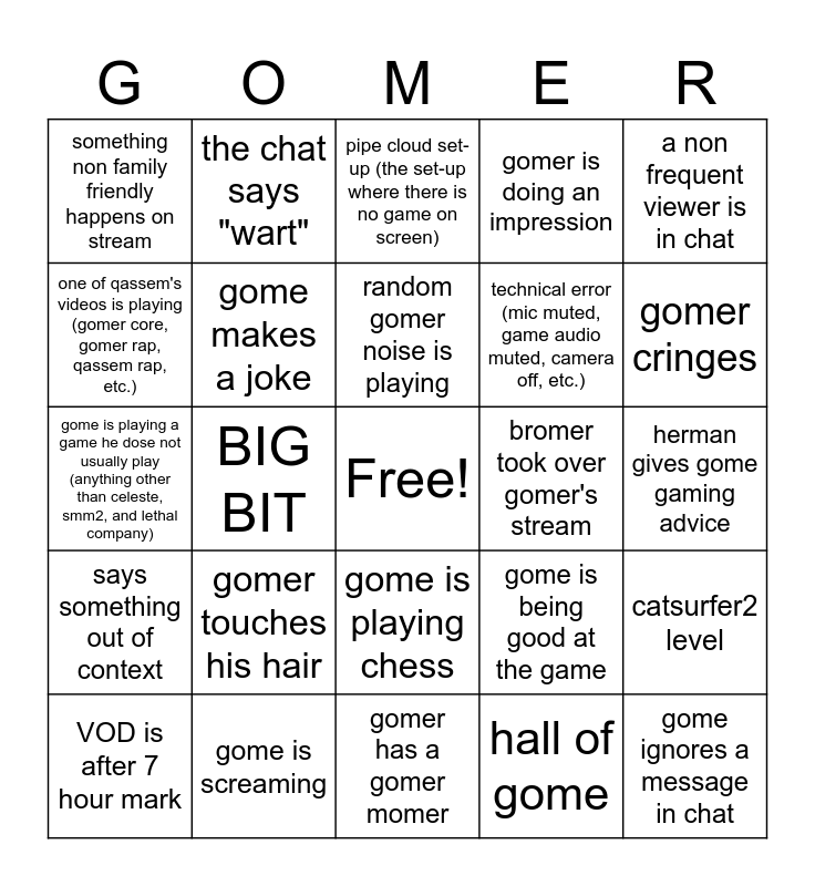 This bingo card has a free space and 25 words: gomer touches his hair, gomer has a gomer momer, random gomer noise is playing, VOD is after 7 hour mark, a non frequent viewer is in chat, something non family friendly happens on stream, one of qassem's videos is playing (gomer core, gomer rap, qassem rap, etc.), the chat says "wart", bromer took over gomer's stream, gome is playing chess, technical error (mic muted, game audio muted, camera off, etc.), gome is playing a game he dose not usually play (anything other than celeste, smm2, and lethal company), gome is being good at the game, catsurfer2 level, gome makes a joke, someone else is talking on vc, herman gives gome gaming advice, pipe cloud set-up (the set-up where there is no game on screen), gomer cringes, BIG BIT, gome ignores a message in chat, gome is screaming, says something out of context, gomer is doing an impression and hall of gome.