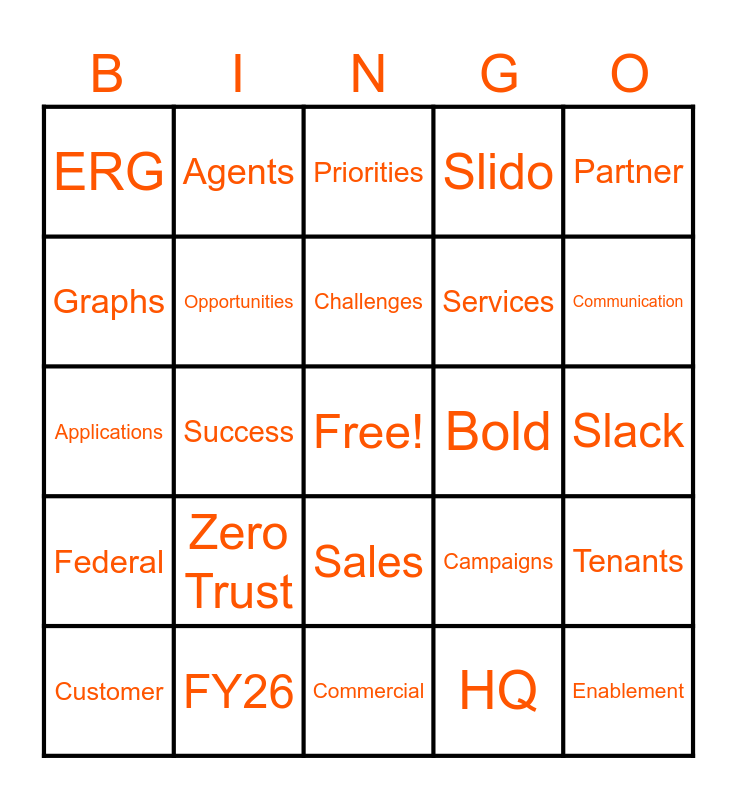 This bingo card has a free space and 58 words: Global, FY26, Growth, Federal, HQ, Foundation, Opportunities, Enlighten, Services, Illumio, Slido, Initiatives, Orange, Reporting, Velocity, ERG, Enablement, Partner, Product, Challenges, Bold, Priorities, Customer, Tenants, Illumineers, Slack, Market, Creation, Communication, Modules, Breach, Core Values, Voice, Security, Transformation, Together, GTM, Success, Applications, AI, Zero Trust, Onwards, Campaigns, Culture, ML, Amplification, Insights, Sales, Commercial, Results, Creation, Managing, Ecosystem, VPCs, Agents, SKO, Graphs and Accelerating.