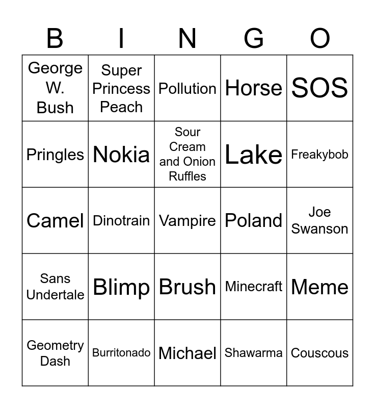 This bingo card has a free space and 24 words: Blimp, Burritonado, Sour Cream and Onion Ruffles, Geometry Dash, SOS, George W. Bush, Pringles, Super Princess Peach, Poland, Brush, Lake, Camel, Minecraft, Meme, Nokia, Shawarma, Joe Swanson, Pollution, Freakybob, Dinotrain, Couscous, Sans Undertale, Horse and Michael.