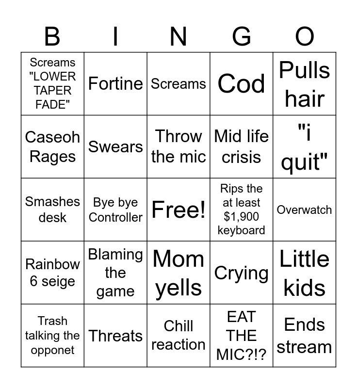 This bingo card has a free space and 24 words: Trash talking the opponet, Blaming the game, Throw the mic, EAT THE MIC?!?, Pulls hair, Screams "LOWER TAPER FADE", Fortine, Screams, Rips the at least $1,900 keyboard, Overwatch, Smashes desk, Swears, Crying, Little kids, Caseoh Rages, Threats, Chill reaction, Cod, "i quit", Rainbow 6 seige, Bye bye Controller, Mom yells, Mid life crisis and Ends stream.