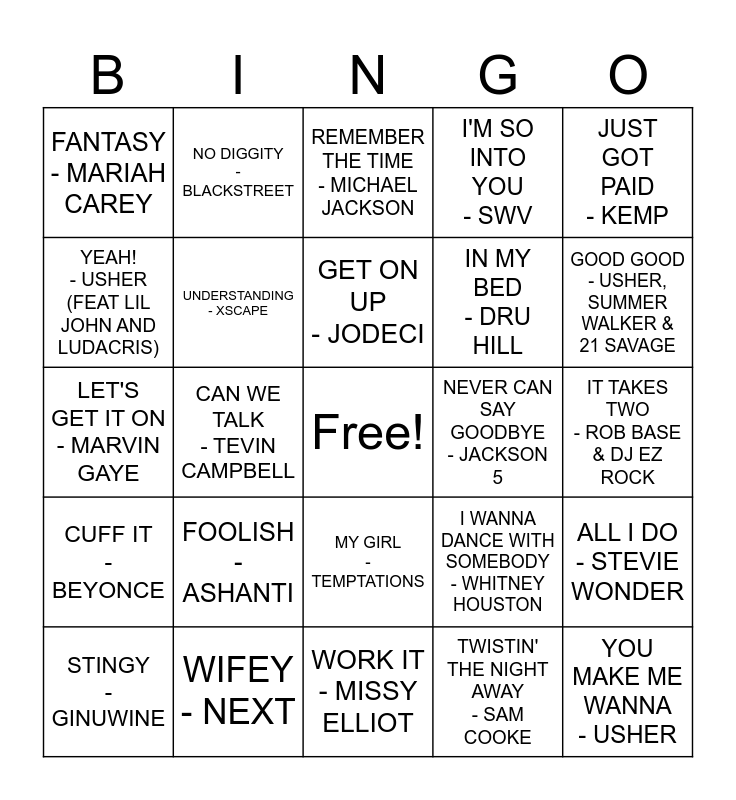 This bingo card has a free space and 24 words: STINGY - GINUWINE, FOOLISH - ASHANTI, GET ON UP - JODECI, TWISTIN' THE NIGHT AWAY - SAM COOKE, JUST GOT PAID - KEMP, FANTASY - MARIAH CAREY, NO DIGGITY - BLACKSTREET, REMEMBER THE TIME - MICHAEL JACKSON, NEVER CAN SAY GOODBYE - JACKSON 5, IT TAKES TWO - ROB BASE & DJ EZ ROCK, LET'S GET IT ON - MARVIN GAYE, UNDERSTANDING - XSCAPE, I WANNA DANCE WITH SOMEBODY - WHITNEY HOUSTON, ALL I DO - STEVIE WONDER, YEAH! - USHER (FEAT LIL JOHN AND LUDACRIS), WIFEY - NEXT, WORK IT - MISSY ELLIOT, I'M SO INTO YOU - SWV, GOOD GOOD - USHER, SUMMER WALKER & 21 SAVAGE, CUFF IT - BEYONCE, CAN WE TALK - TEVIN CAMPBELL, MY GIRL - TEMPTATIONS, IN MY BED - DRU HILL and YOU MAKE ME WANNA - USHER.