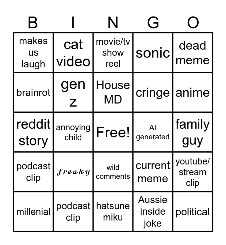 This bingo card has a free space and 24 words: 𝓯𝓻𝓮𝓪𝓴𝔂, podcast clip, House MD, millenial, dead meme, makes us laugh, brainrot, cat video, AI generated, wild comments, cringe, reddit story, current meme, youtube/ stream clip, gen z, Aussie inside joke, family guy, movie/tv show reel, anime, annoying child, political, podcast clip, sonic and hatsune miku.