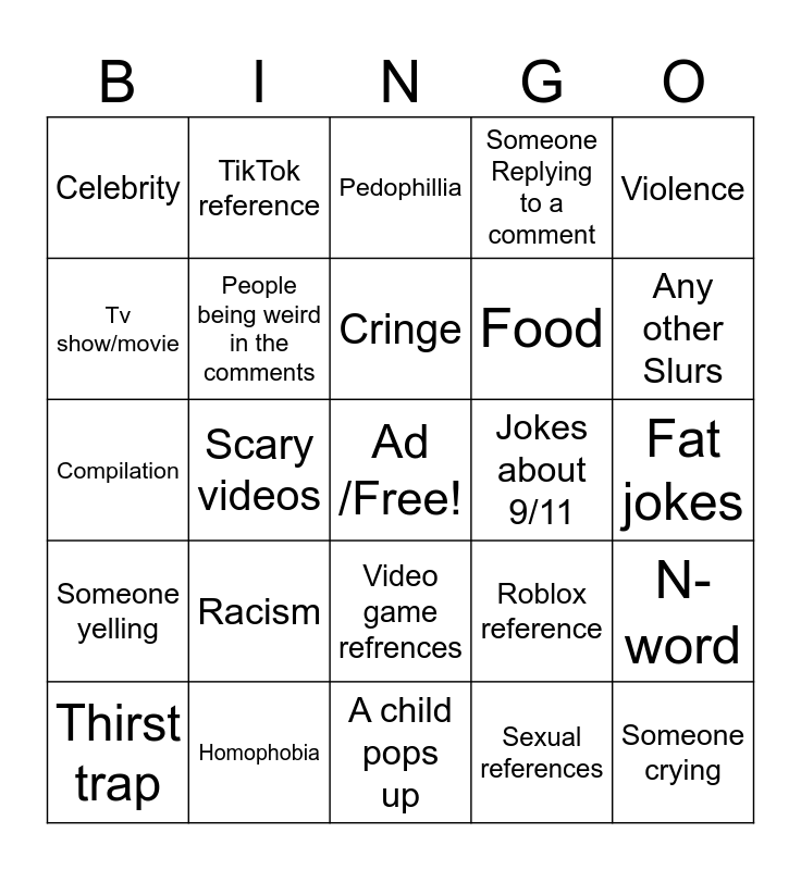 This bingo card has a free space and 24 words: Racism, Homophobia, Cringe, Thirst trap, Violence, Celebrity, Tv show/movie, TikTok reference, Jokes about 9/11, Video game refrences, Food, Compilation, Roblox reference, N- word, People being weird in the comments, Sexual references, Fat jokes, Pedophillia, Any other Slurs, Scary videos, Someone crying, Someone yelling, Someone Replying to a comment and A child pops up.