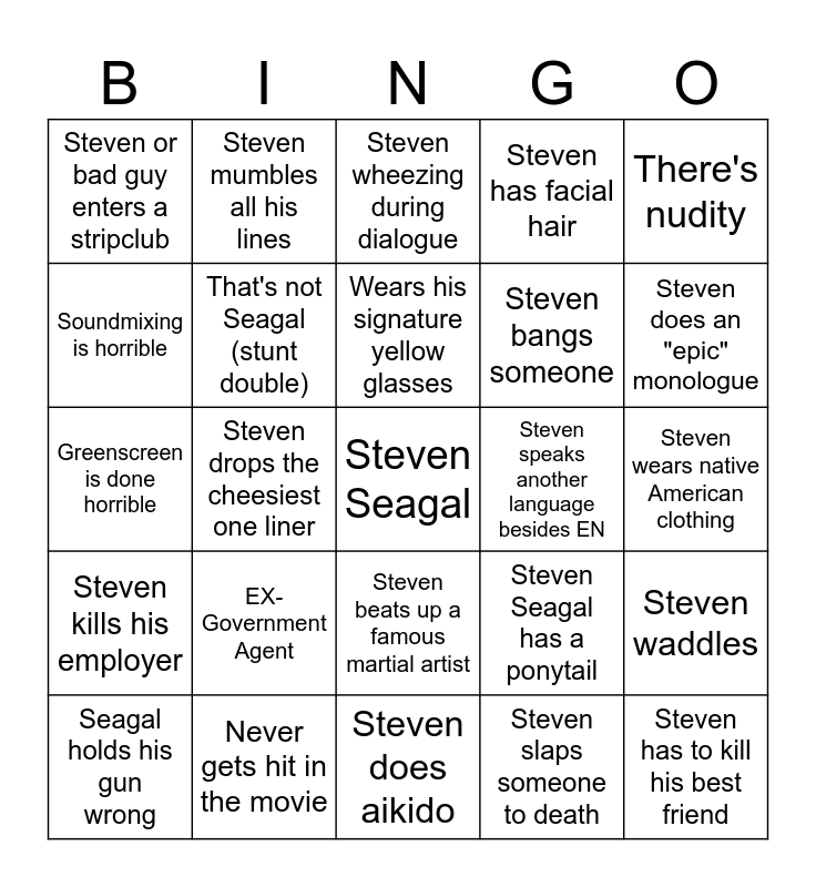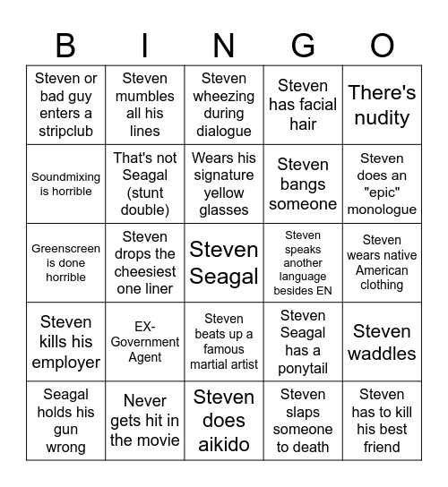 This bingo card has a free space and 24 words: EX-Government Agent, Never gets hit in the movie, Wears his signature yellow glasses, Seagal holds his gun wrong, There's nudity, Steven or bad guy enters a stripclub, Soundmixing is horrible, Steven mumbles all his lines, Steven speaks another language besides EN, Steven beats up a famous martial artist, Steven bangs someone, Greenscreen is done horrible, Steven Seagal has a ponytail, Steven waddles, That's not Seagal (stunt double), Steven slaps someone to death, Steven wears native American clothing, Steven wheezing during dialogue, Steven does an "epic" monologue, Steven drops the cheesiest one liner, Steven has to kill his best friend, Steven kills his employer, Steven has facial hair and Steven does aikido.