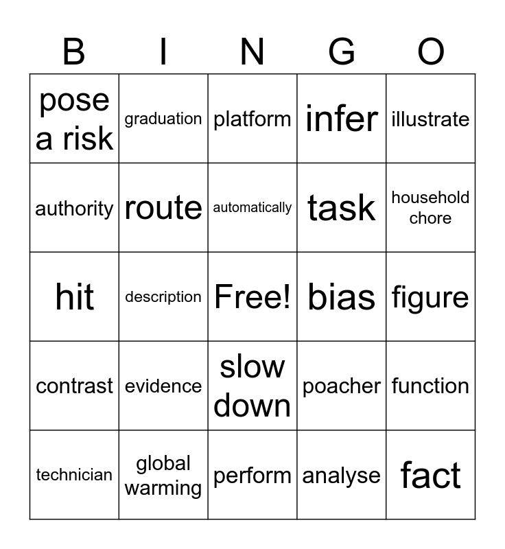 This bingo card has a free space and 41 words: commercial, hit, climate change, route, global warming, slow down, automatically, security, illustrate, contrast, description, infer, fact, figure, bias, evidence, mature, pose a risk, privacy, platform, function, condition, perform, task, such as = like, carry out, analyse, preserve = conserve, household chore, suddenly, publicity, graduation, technician, conservation, poacher, authority, consider, harsh, punishment, legal >< illegal and version.