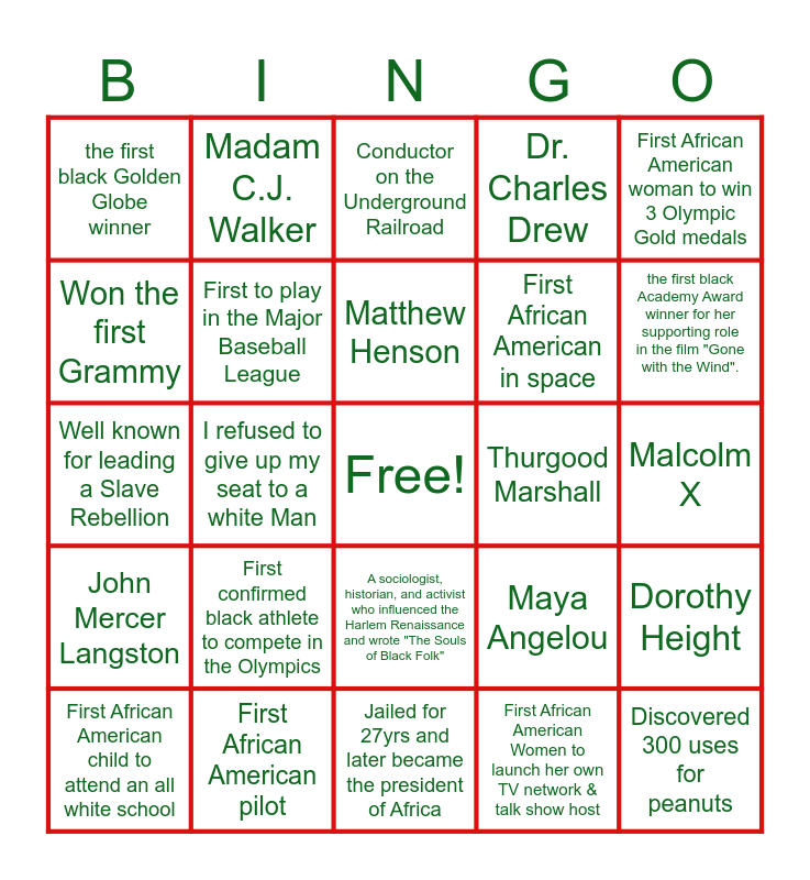 This bingo card has a free space and 29 words: First African American child to attend an all white school, Barack Obama, I refused to give up my seat to a white Man, Civil Rights Leader.. and well known for "I have a Dream", the first black Golden Globe winner, Conductor on the Underground Railroad, First to play in the Major Baseball League, First confirmed black athlete to compete in the Olympics, Thurgood Marshall, First African American pilot, Malcolm X, Discovered 300 uses for peanuts, Jailed for 27yrs and later became the president of Africa, First African American Women to launch her own TV network & talk show host, the first black Academy Award winner for her supporting role in the film "Gone with the Wind"., First African American to earn a medical degree, A sociologist, historian, and activist who influenced the Harlem Renaissance and wrote "The Souls of Black Folk", John Mercer Langston, First African American woman to win 3 Olympic Gold medals, Well known for leading a Slave Rebellion, Maya Angelou, the first slave legally freed by Abraham Lincoln in 1841., First African American in space, Won the first Grammy, Dr. Charles Drew, Madam C.J. Walker, Dorothy Height, Matthew Henson and Bayard Rustin.