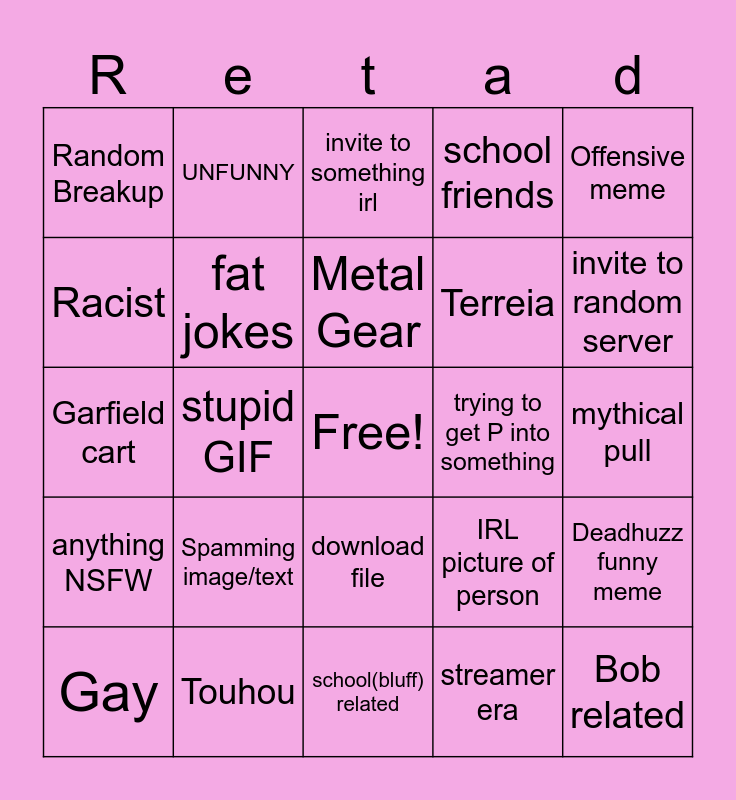 This bingo card has a free space and 24 words: Spamming image/text, Touhou, Metal Gear, Gay, Offensive meme, Random Breakup, Racist, UNFUNNY, trying to get P into something, download file, Terreia, Garfield cart, IRL picture of person, Deadhuzz funny meme, fat jokes, streamer era, mythical pull, invite to something irl, invite to random server, stupid GIF, Bob related, anything NSFW, school friends and school(bluff) related.