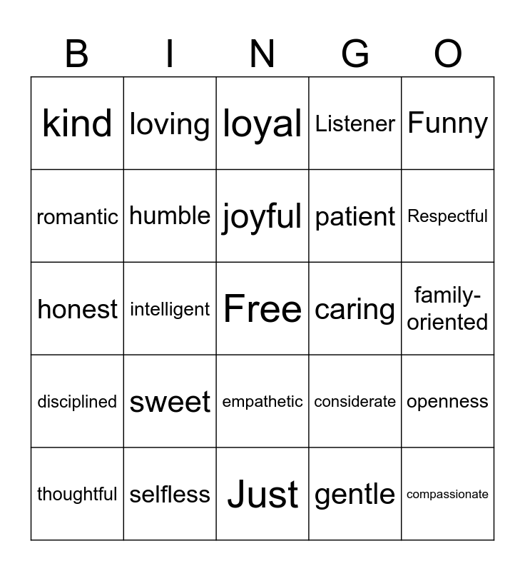 This bingo card has a free space and 24 words: sweet, selfless, joyful, thoughtful, Funny, kind, romantic, loving, caring, empathetic, patient, honest, considerate, openness, humble, gentle, family-oriented, loyal, Respectful, intelligent, compassionate, disciplined, Listener and Just.