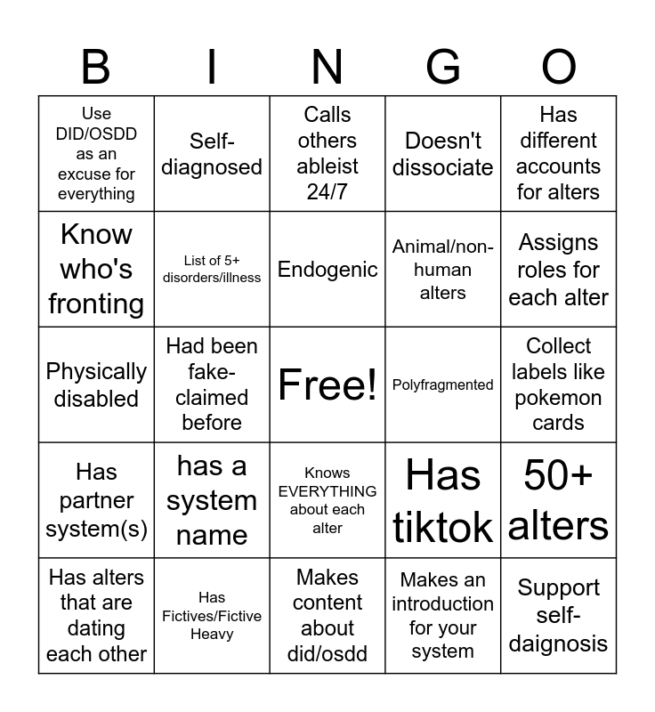 This bingo card has a free space and 24 words: has a system name, Has Fictives/Fictive Heavy, Endogenic, Has alters that are dating each other, Has different accounts for alters, Use DID/OSDD as an excuse for everything, Know who's fronting, Self-diagnosed, Polyfragmented, Knows EVERYTHING about each alter, Animal/non-human alters, Physically disabled, Has tiktok, 50+ alters, List of 5+ disorders/illness, Makes an introduction for your system, Collect labels like pokemon cards, Calls others ableist 24/7, Assigns roles for each alter, Had been fake-claimed before, Support self-daignosis, Has partner system(s), Doesn't dissociate and Makes content about did/osdd.