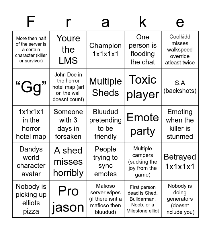 This bingo card has 25 words: A shed misses horribly, Mafioso server wipes (if there isnt a mafioso then bluudud), Multiple Sheds, Nobody is picking up elliots pizza, Coolkidd misses walkspeed override atleast twice, More then half of the server is a certain character (killer or survivor), “Gg”, Youre the LMS, Emote party, People trying to sync emotes, Toxic player, 1x1x1x1 in the horror hotel map, Multiple campers (sucking the joy from the game), Betrayed 1x1x1x1, John Doe in the horror hotel map (art on the wall doesnt count), Nobody is doing generators (doesnt include you), Emoting when the killer is stunmed, Champion 1x1x1x1, S.A (backshots), Someone with 3 days in forsaken, Bluudud pretending to be friendly, Pro jason, Dandys world character avatar, One person is flooding the chat and First person dead is Shed, Builderman, Noob, or a Milestone elliot.