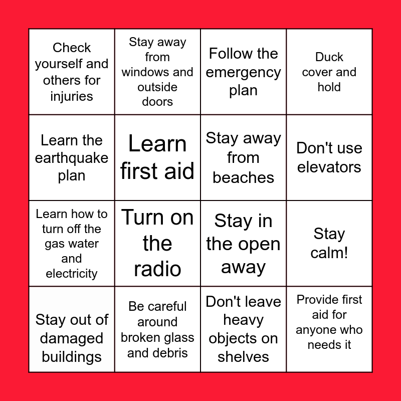 This bingo card has 16 words: Stay out of damaged buildings, Be careful around broken glass and debris, Follow the emergency plan, Duck cover and hold, Learn the earthquake plan, Stay away from windows and outside doors, Stay in the open away, Stay calm!, Check yourself and others for injuries, Learn first aid, Don't leave heavy objects on shelves, Don't use elevators, Learn how to turn off the gas water and electricity, Turn on the radio, Stay away from beaches and Provide first aid for anyone who needs it.