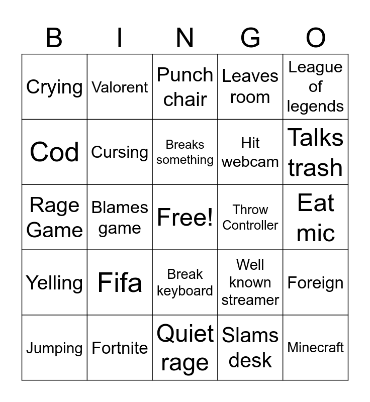 This bingo card has a free space and 24 words: Fifa, Fortnite, Breaks something, Jumping, League of legends, Crying, Cod, Valorent, Throw Controller, Break keyboard, Hit webcam, Rage Game, Well known streamer, Foreign, Cursing, Slams desk, Eat mic, Punch chair, Talks trash, Blames game, Minecraft, Yelling, Leaves room and Quiet rage.