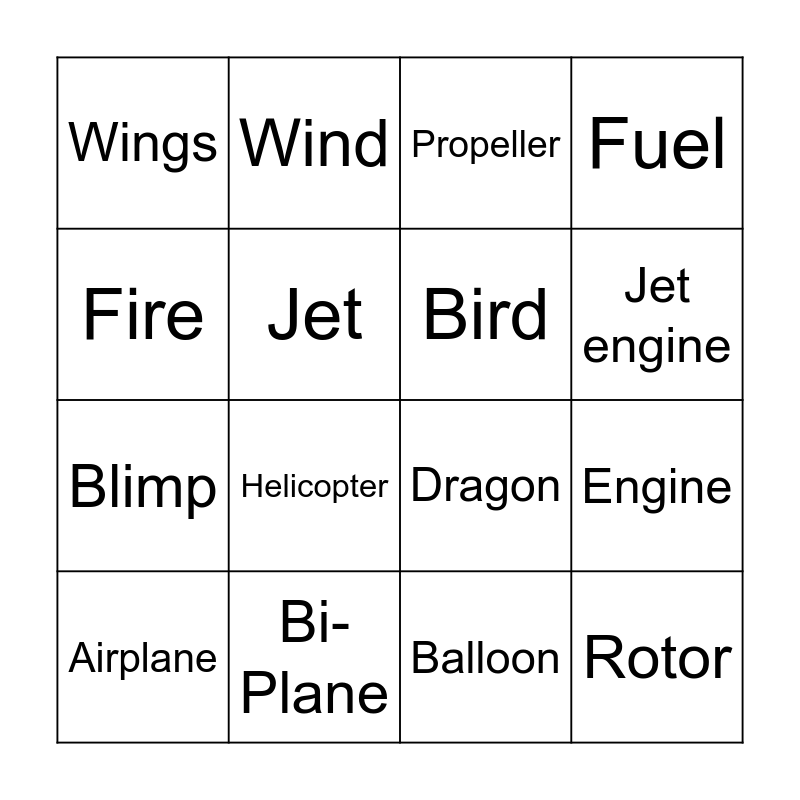 This bingo card has 16 words: Bi-Plane, Engine, Propeller, Wings, Blimp, Wind, Dragon, Balloon, Fire, Jet, Airplane, Fuel, Helicopter, Jet engine, Bird and Rotor.
