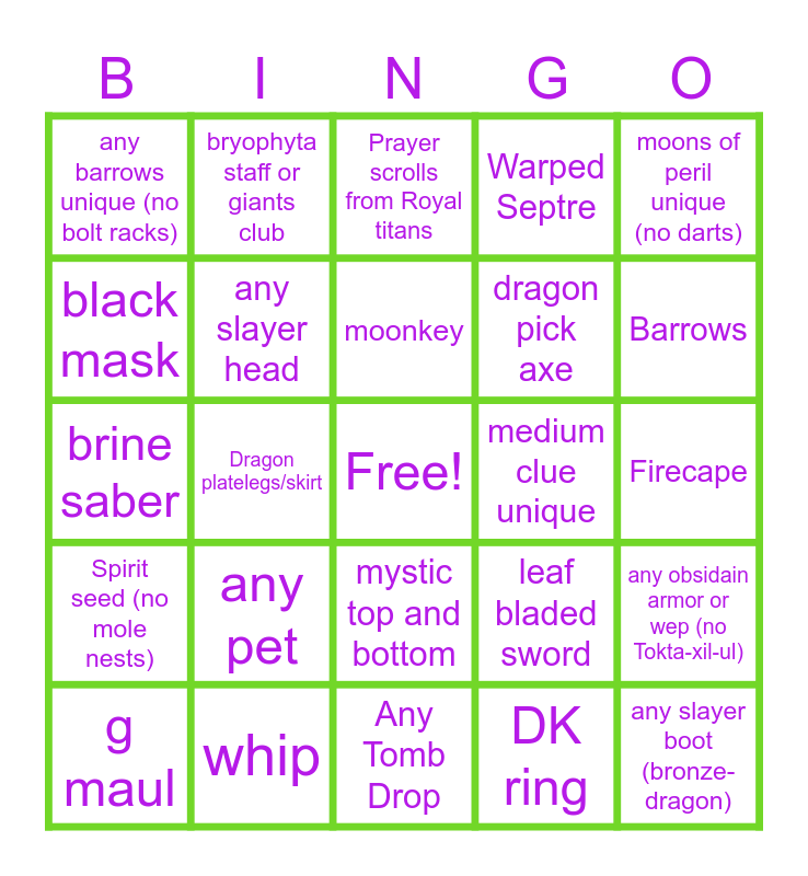 This bingo card has a free space and 24 words: any pet, whip, moonkey, g maul, moons of peril unique (no darts), any barrows unique (no bolt racks), black mask, bryophyta staff or giants club, medium clue unique, mystic top and bottom, dragon pick axe, brine saber, leaf bladed sword, any obsidain armor or wep (no Tokta-xil-ul), any slayer head, DK ring, Firecape, Prayer scrolls from Royal titans, Barrows, Dragon platelegs/skirt, any slayer boot (bronze- dragon), Spirit seed (no mole nests), Warped Septre and Any Tomb Drop.