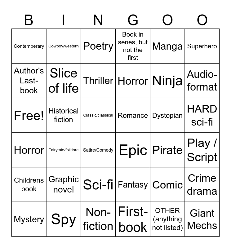 This bingo card has 36 words: Fantasy, Sci-fi, First-book, Author's Last-book, Horror, Romance, Slice of life, Non-fiction, Manga, Comic, Audio-format, Book in series, but not the first, Crime drama, Historical fiction, Horror, Contemperary, Childrens book, Dystopian, Free!, Poetry, Classic/classical, Fairytale/folklore, Epic, Satire/Comedy, Pirate, Cowboy/western, Ninja, Spy, Thriller, Superhero, Giant Mechs, Mystery, Play / Script, HARD sci-fi, Graphic novel and OTHER (anything not listed).