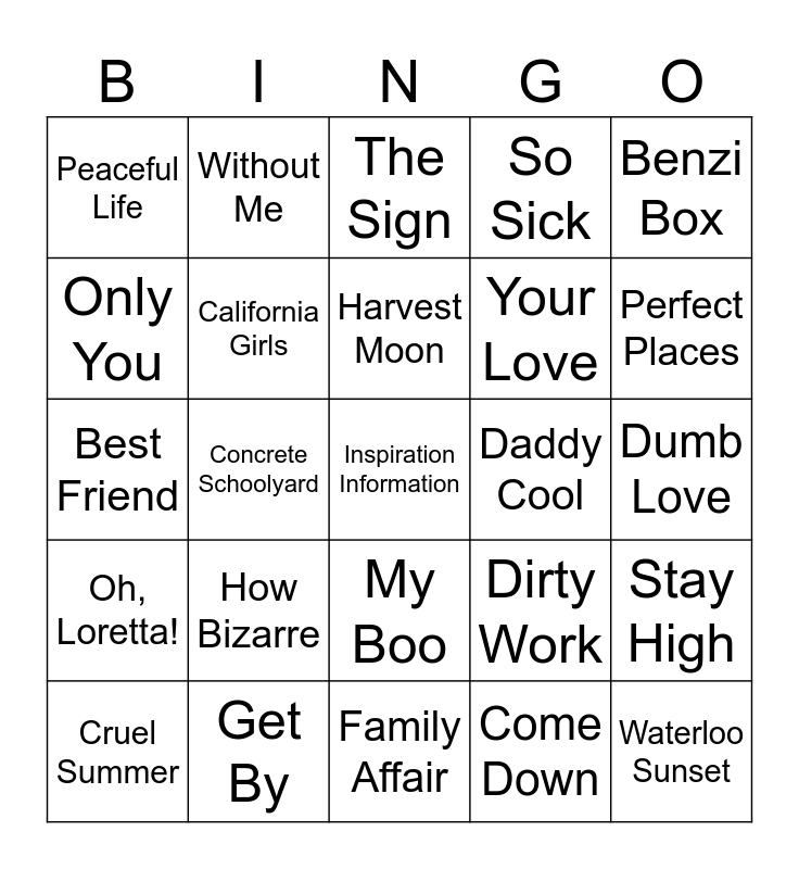 This bingo card has 35 words: Bad Day, California Love, California Dreamin', California Girls, My Boo, So Sick, Only You, Make Luv, Harvest Moon, Kick, Push, Best Friend, Benzi Box, Cool Cat, Beautiful Escape, Peaceful Life, Daddy Cool, Come Down, Concrete Schoolyard, Oh, Loretta!, Inspiration Information, Dirty Work, Cruel Summer, Stay High, Get By, The Sign, Perfect Places, Waterloo Sunset, Blak Britney, Your Love, Dumb Love, Fake ID, Family Affair, How Bizarre, Without Me and Tom's Diner.