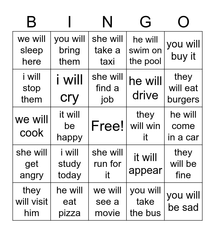 This bingo card has a free space and 24 words: i will study today, he will eat pizza, she will find a job, they will visit him, you will buy it, we will sleep here, i will stop them, you will bring them, they will win it, she will run for it, he will drive, we will cook, it will appear, they will be fine, i will cry, you will take the bus, he will come in a car, she will take a taxi, they will eat burgers, it will be happy, you will be sad, she will get angry, he will swim on the pool and we will see a movie.