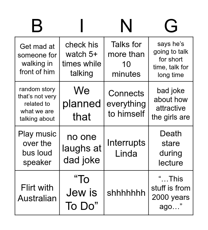 This bingo card has 16 words: “To Jew is To Do”, Death stare during lecture, Talks for more than 10 minutes, Get mad at someone for walking in front of him, Play music over the bus loud speaker, check his watch 5+ times while talking, Interrupts Linda, shhhhhhh, random story that’s not very related to what we are talking about, We planned that, Flirt with Australian, says he’s going to talk for short time, talk for long time, no one laughs at dad joke, bad joke about how attractive the girls are, Connects everything to himself and “…This stuff is from 2000 years ago…”.